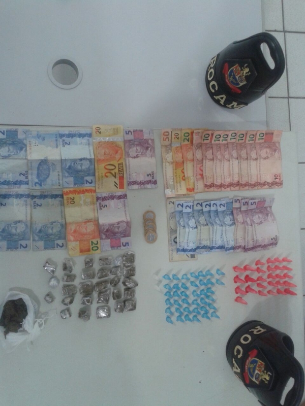 De acordo com informações da PM as equipes realizavam patrulhamento com o objetivo de coibir furtos e roubos quando visualizaram três indivíduos em atitude suspeita na rua Pedro Alves Filho. Eles perceberam a aproximação das viaturas e fugiram correndo, dando início ao acompanhamento. O trio foi detido próximo a rua Diomar Raspante e durante a busca pessoal os policias localizaram com todos os rapazes 29 pinos de cocaína, 38 pinos de crack, 29 porções de maconha e R$ 259 em dinheiro do crime.
