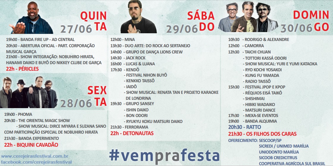 A programação de shows começa nesta quinta-feira, dia 27, com a apresentação do cantor Péricles. Sexta, dia 28, será a vez da apresentação da banda Biquíni Cavadão, e no sábado, dia 29, Detonautas. Domingo, dia 30, o público terá o show de Os Filhos dos Caras.