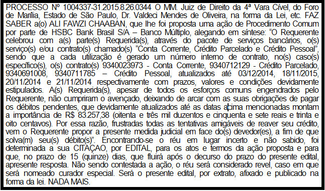 EDITAL DE INTIMAÇÃO: 4ª Vara Cível do Foro de Marília/SP