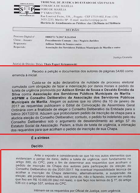 A juiza Thaís Fegouri Krizanowski, da 5ª Vara Cível de Marília, determinou nesta tarde que a Associação dos Servidores Públicos Municipais de Marília (Aspmm) aceite a inscrição da chapa "Renovação" que disputa as eleições para o conselho deliberativo da entidade para os próximos dois anos. A atual diretoria entende que a inscrição da chapa teria ocorrido fora do prazo estabelecido no estatuto da entidade.