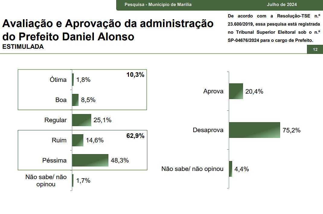Na pesquisa do Instituto Paraná, a administração do prefeito Daniel Alonso também foi avaliada. Mas, não apresenta bons números: 75,2% reprovaram e 20,4% aprovaram o trabalho dele nesses oito anos de governo.
