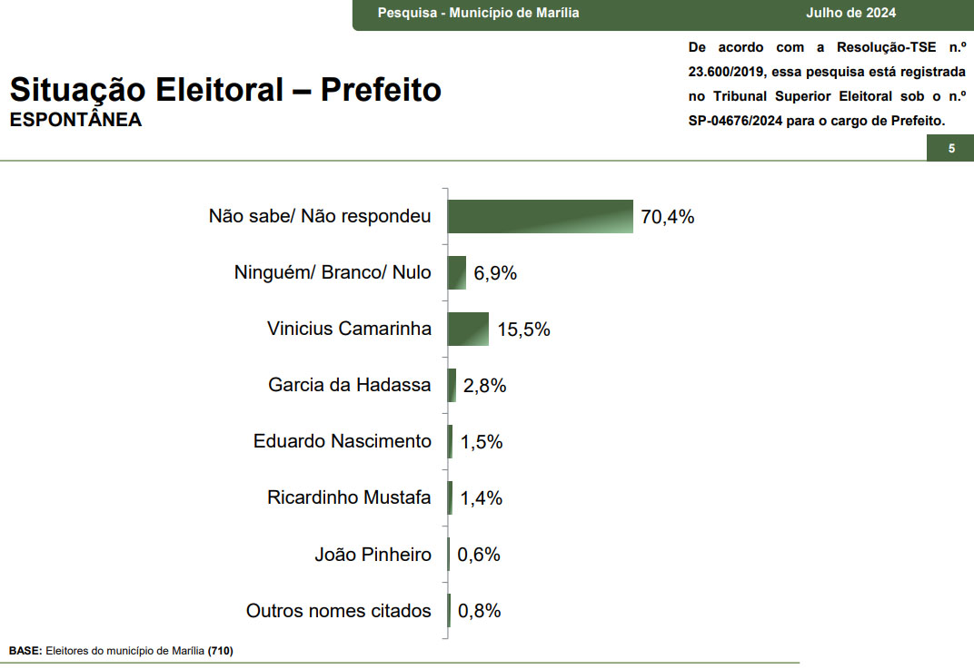 De acordo com o resultado, mais de 70% daqueles que responderam às perguntas estariam indecisos sobre a escolha do novo prefeito, pelo menos na pesquisa "espontânea". Vinicius Camarinha estaria na frente com 15,5% dos votos, vindo em seguida Garcia da Hadassa com 2,8%, e os candidatos Eduardo Nascimento e Ricardinho Mustafá embolados, além de João Pinheiro.