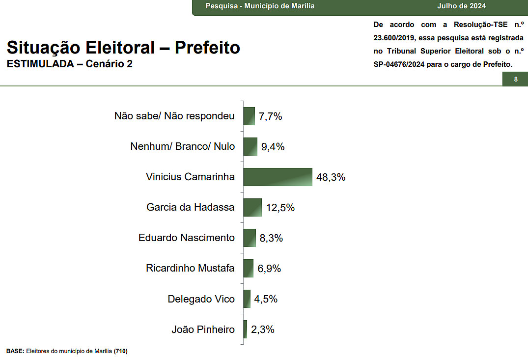 O Instituto Paraná ouviu 710 eleitores, para um universo de 164 mil oficialmente inscritos em Marília. A coleta de dados ocorreu entre os dias 19 e 22 de julho. A margem estimada de erro é de aproximadamente 3,8 pontos percentuais para os resultados gerais.