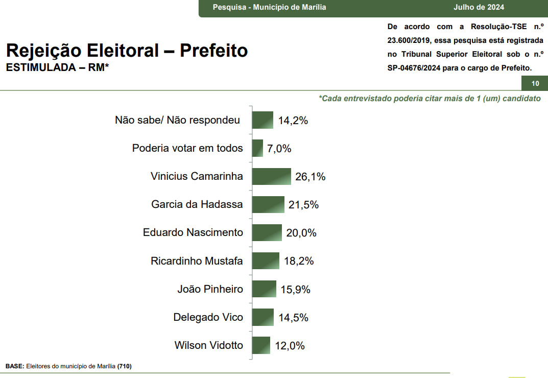Embora apareça na primeira colocação nas duas pesquisas acima (espontânea e estimulada), Vinicius Camarinha é o candidato com maior índice de rejeição, com 26,1% dos eleitores, vindo logo depois "embolados", Garcia da Hadassa e Eduardo Nascimento, respectivamente com 21,5% e 20,0%.