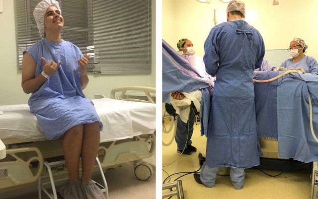 Henrique em dois momentos: se preparando para a mastectomia e depois já na mesa de operação para retirar os seios em 2018