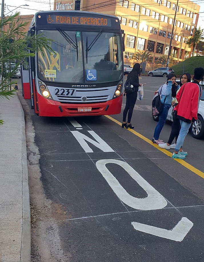 Além disso, a sinalização de solo implementada, com marcação de área exclusiva para os ônibus, informa corretamente a área de embarque e desembarque (ponto com cobertura).