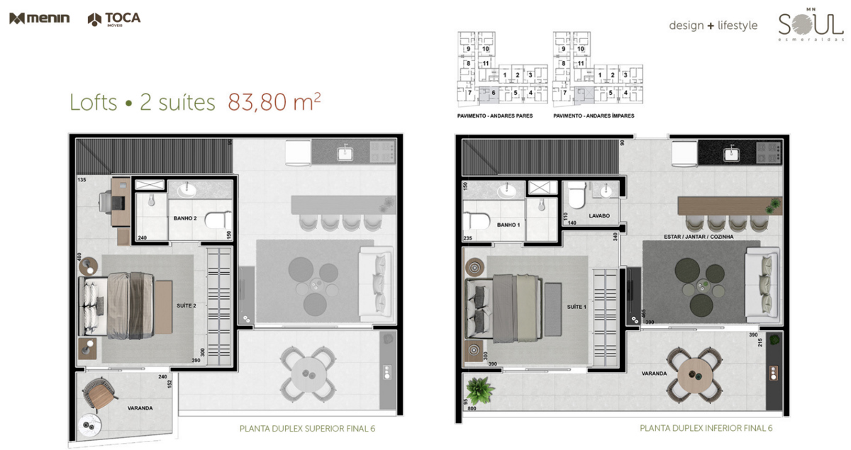 Os apartamentos exclusivos oferecem opções como a do Loft, com pé direito duplo e mesanino, para duas suítes.