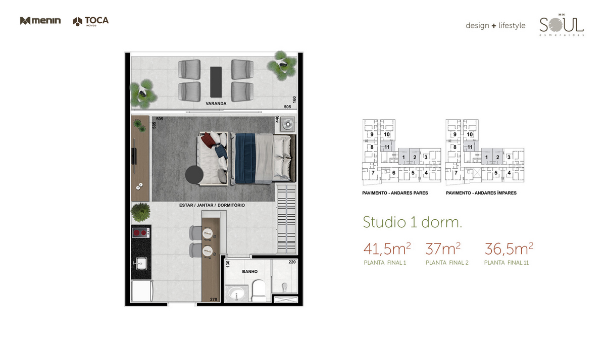 Os estúdios (sem paredes) oferecem um dormitório com sala de jantar e estar integrados, com cozinha, varanda e banheiro, em três pequenas variações de plantas de 36,5m2, 37m2 e 41,5m2. Os lofts com pé direito duplo (dois andares) e duas suítes, duas varandas e sala de jantar, de estar e cozinha integradas, compõem 83,80m2 de área.