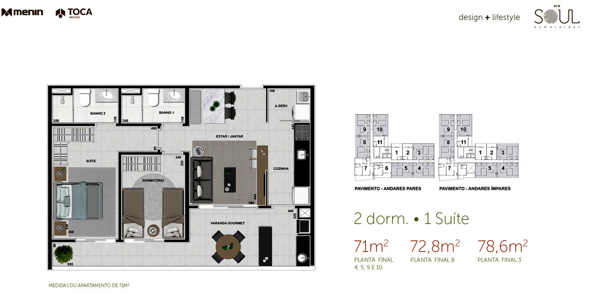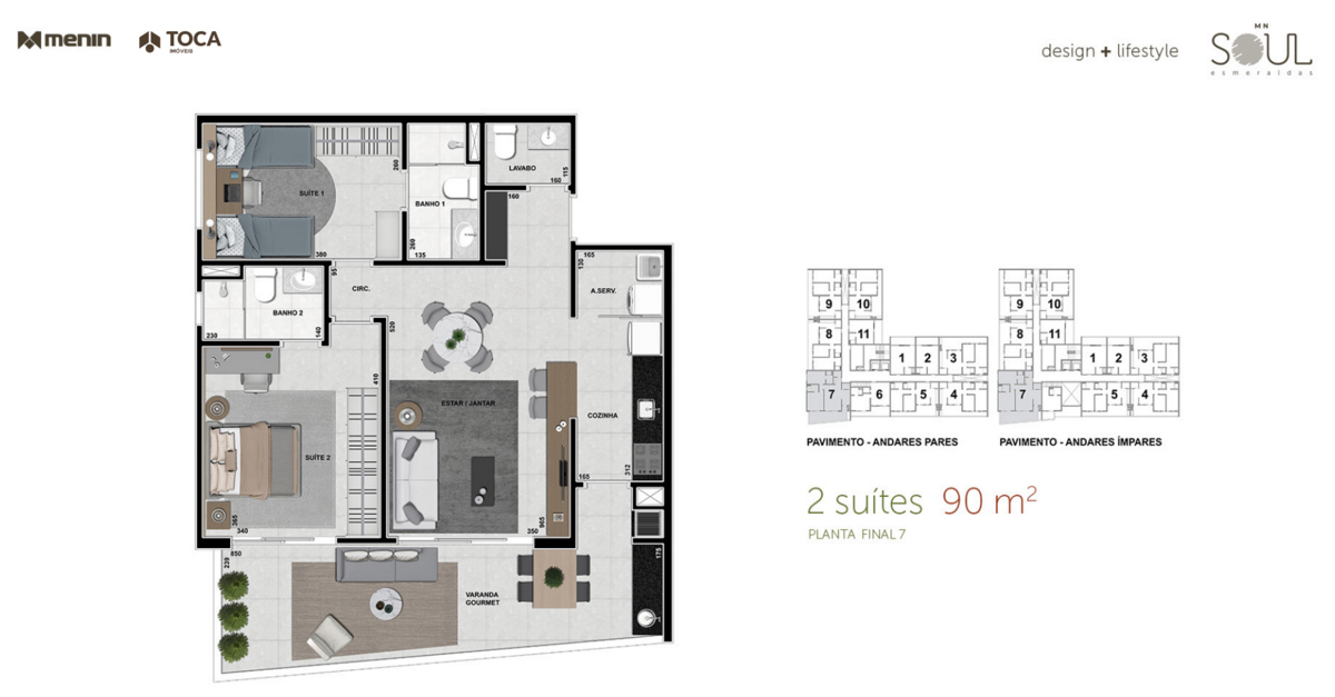 O apartamento de dois dormitórios (sendo um suíte) oferece varanda gourmet, com lavabo, sala de estar, de jantar, área de serviço em três pequenas variações de plantas, de 71m2, 72,8m2 e 78,6m2. O maior apartamento é o de duas suítes, com 90m2, varanda gourmet ampla e jardinada, com lavabo, sala de estar, de jantar, área de serviço.