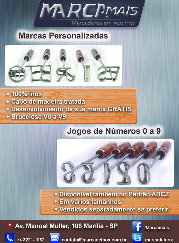Marcas para gado e cavalos em Aço Inox, Jogo de números normal e padrão ABCZ, Marca da Brucelose, Jogo de Brucelose, Mochador martelo convaco e reto, Freios e bridões, Argolas de inox, Fivelas, Cabeçadas, Rédias, Barrigueiras, Entre outros.