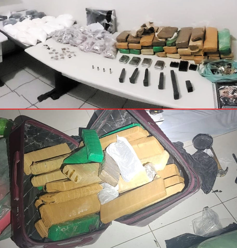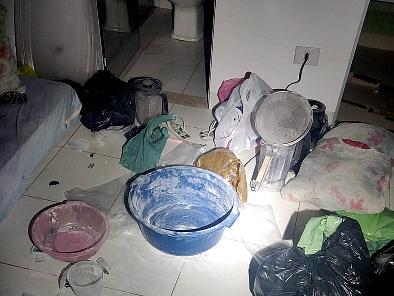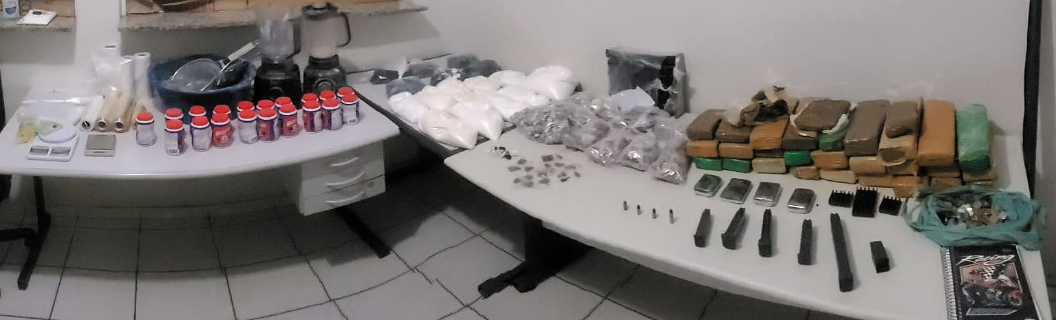 No imóvel, o flagrante ficou ainda maior: foram apreendidos mais tabletes de maconha (totalizando 29,4 quilos), 13,5 quilos de cocaína, quase meio quilo de haxixe, porção de crack, material usado para preparar as porções para venda (a cocaína é misturada com produtos, como fermento em pó), balanças digitais e até liquidificadores.