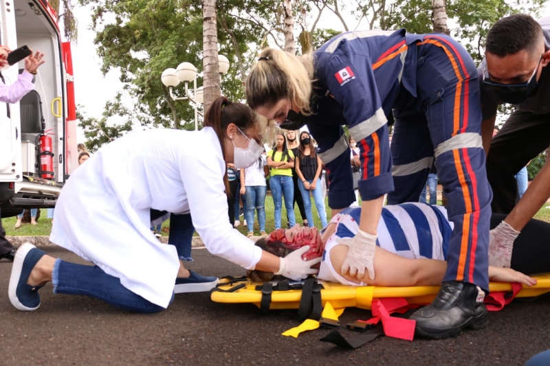O simulado de atendimento pré-hospitalar em acidente de trânsito foi composto por vítimas de diferentes complexidades, onde os próprios alunos atuaram, com a proposta de fazer o correto resgate e os atendimentos por prioridade.
