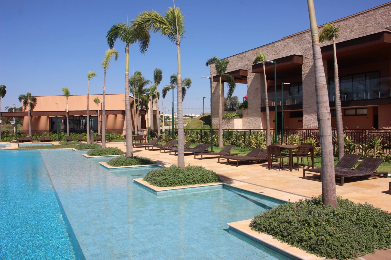 O clube resort de 21 mil m2 oferece espaços sociais, salões, academia, em um projeto arquitetônico único na cidade.