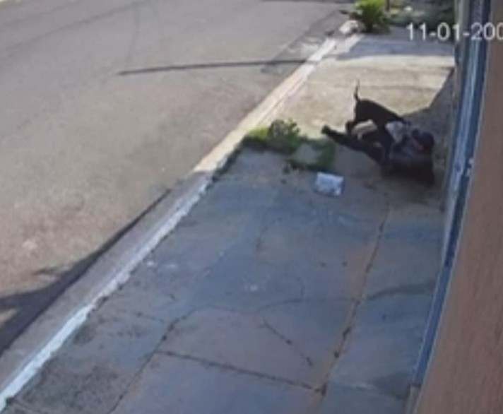 Neste momento, o pitbull acabou escapando e investiu contra a vítima. Imagens de câmera de segurança mostram que o rapaz ainda tentou correr, mas acabou caindo, sofrendo diversos ferimentos. Ele conseguiu se refugiar em cima de uma lixeira.
