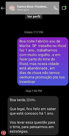 Em mensagem ao Visão Notícias, eles enviaram uma conversa (via aplicativo) que tiveram com o presidente do iFood, Fabrício Bloisi (foto).