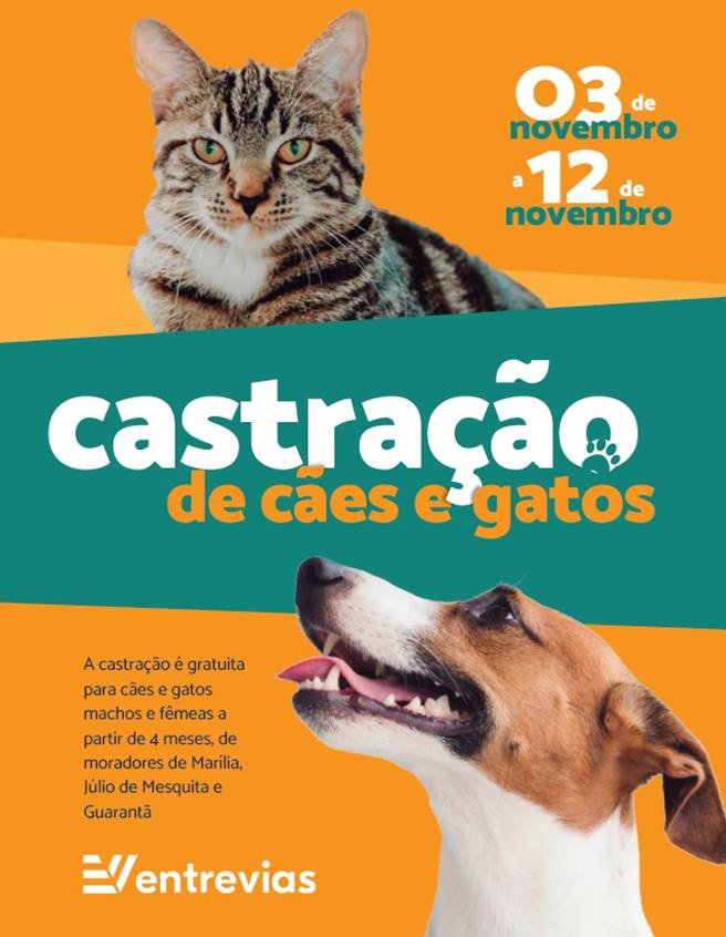 A Entrevias Concessionária de Rodovias realiza até o dia 12 de novembro, a segunda fase do programa de castração de animais na região de Marília.