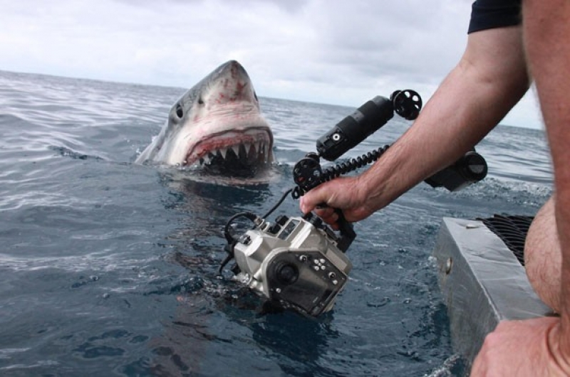 A foto mostra o grande tubarão com sua poderosa mandíbula fora d'água a cerca de um metro de distância de onde um membro da equipe de Riggs segurava uma câmera na água, na parte de trás do barco.