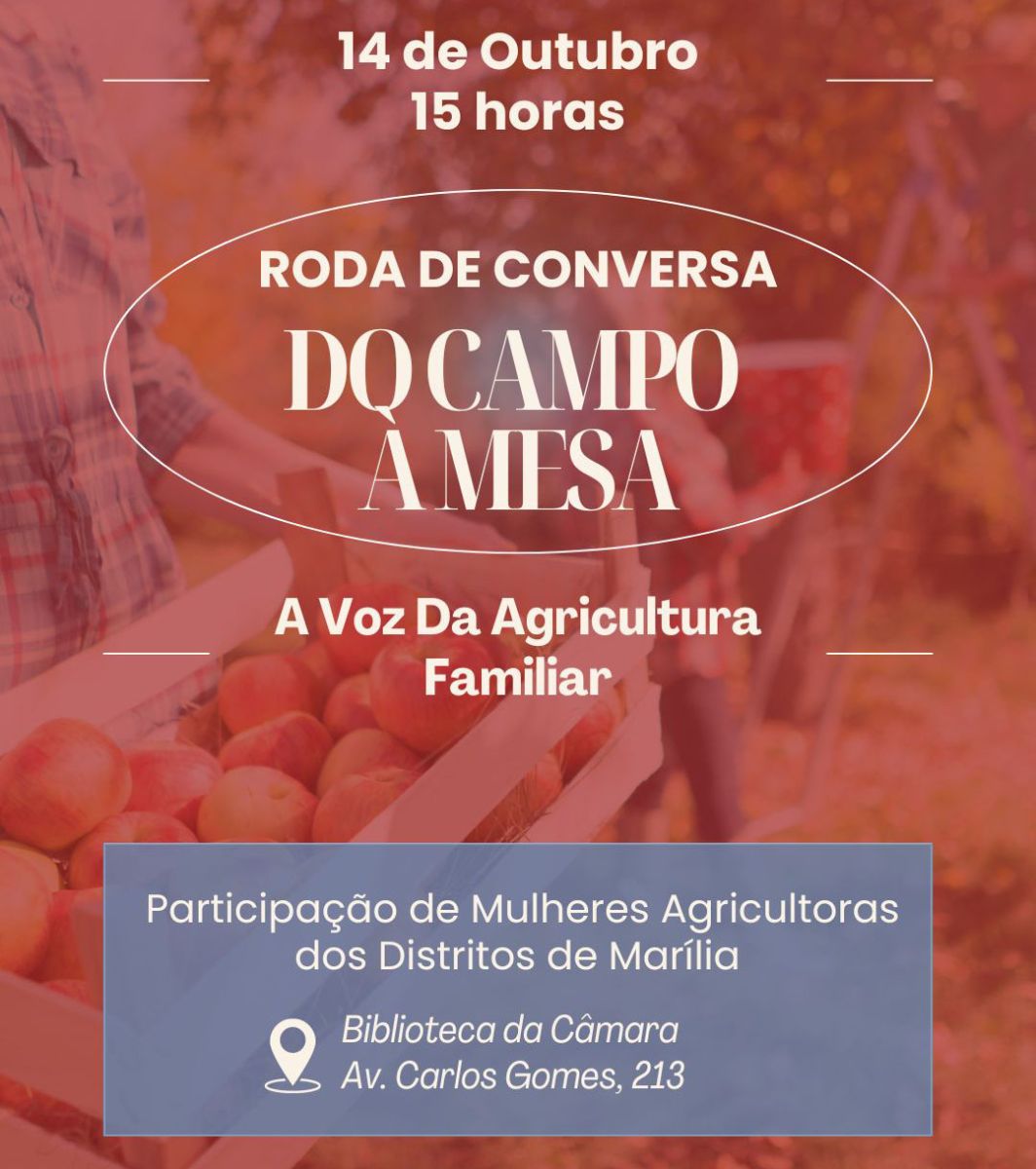 A Escola do Legislativo da Câmara de Marília realizará na próxima segunda-feira (dia 14), a partir das 15 horas, na Biblioteca da Câmara, a roda de conversa "Do campo à mesa: a voz da agricultura familiar".