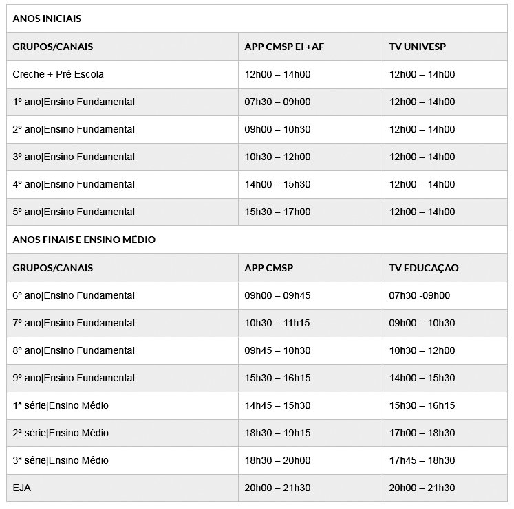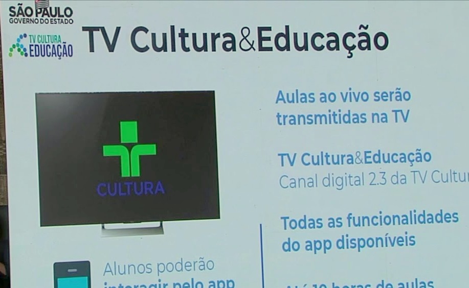 De acordo com a Secretaria Estadual da Educação, o ensino remoto passa a ser feito por meio dos aplicativos Centro de Mídias SP (CMSP) e dos canais digitais 2.2 – TV Univesp e 2.3 – TV Educação.