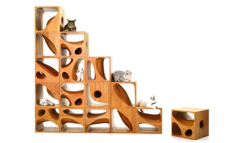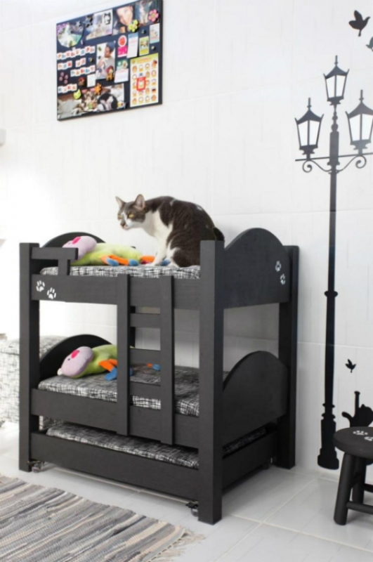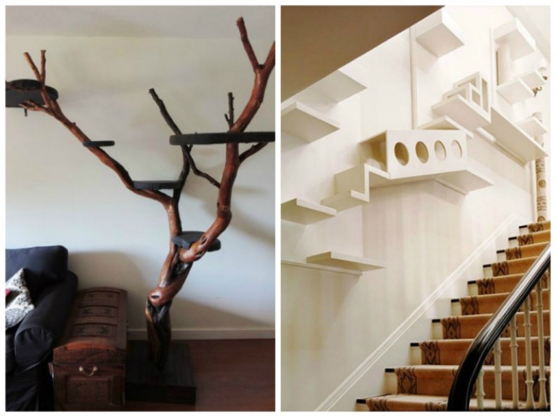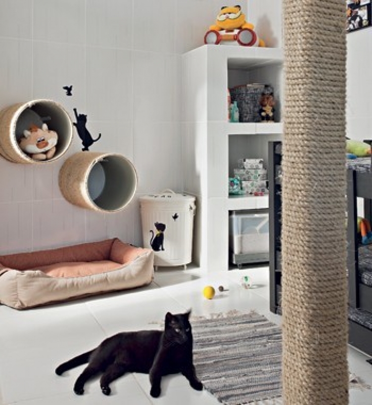 Existem diversas opções prontas no mercado, assim como é possível o desenvolvimento de um armário com vários nichos e passagens, com dupla função: servir de armário para os objetos e local de exploração para o seu gatinho.