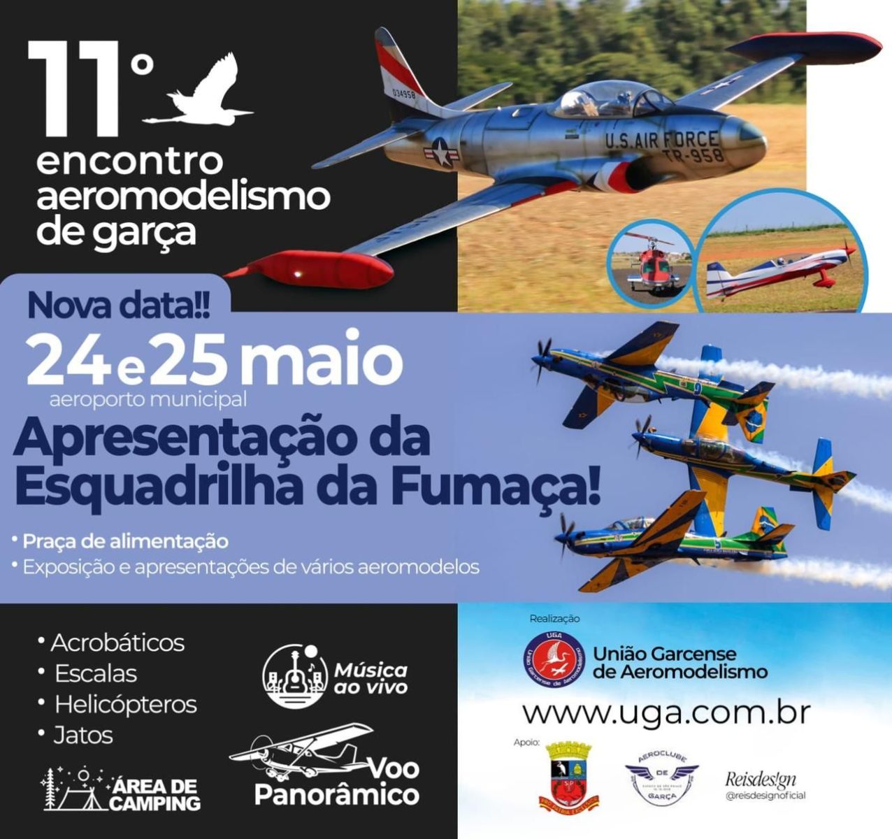 Aliás, a apresentação ainda não consta na agenda oficial do EDA, mas é de praxe as novas apresentações serem atualizadas posteriormente, mesmo porque outro integrante da Esquadrilha (capitão Neves) já realizou uma visita técnica ao local (aeroporto de Garça). O evento é organizado pela UGA – União Garcense de Aeromodelismo.