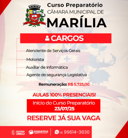 Contando com professores experientes que serão fundamentais para a preparação, o Esquema Concursos iniciou esta semana o curso preparatório para o concurso da Câmara Municipal de Marília. Estão sendo oferecidas 10 vagas para diferentes funções. As inscrições para o concurso já se encerraram.