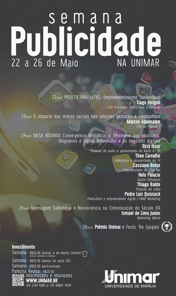 As inscrições devem ser feitas no site www.unimar.br/semanas/publicidade/ e o investimento é de R$ 60 para alunos e egressos da Unimar, R$ 70 para estudantes de outras instituições, R$ 80 para profissionais, além de R$ 20 por palestra avulsa.