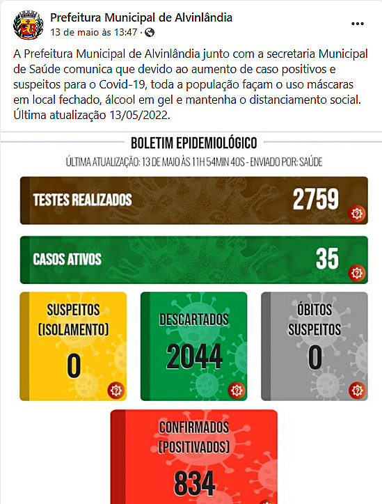 Segundo a prefeitura, o município com cerca de 3,2 mil habitantes registrou um salto de 19 casos num período de apenas três dias, fazendo a cidade passar de 16 para 35 novos casos de Covid.