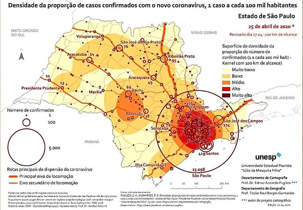 O estudo da Unesp elenca 15 cidades que, juntas, concentram 70% do total de casos e mortes no Estado de São Paulo. O professor Carlos Magno Fortaleza enfatizou que é preciso manter expressivo índice de isolamento social nesses polos para evitar que o contágio atinja também os de menor porte, seguindo a classificação do Instituto Brasileiro de Geografia e Estatística (IBGE), que prevê quatro tipos de municípios no interior: os polos regionais, os extremamente conectados com polos, os menos conectados e os rurais.
