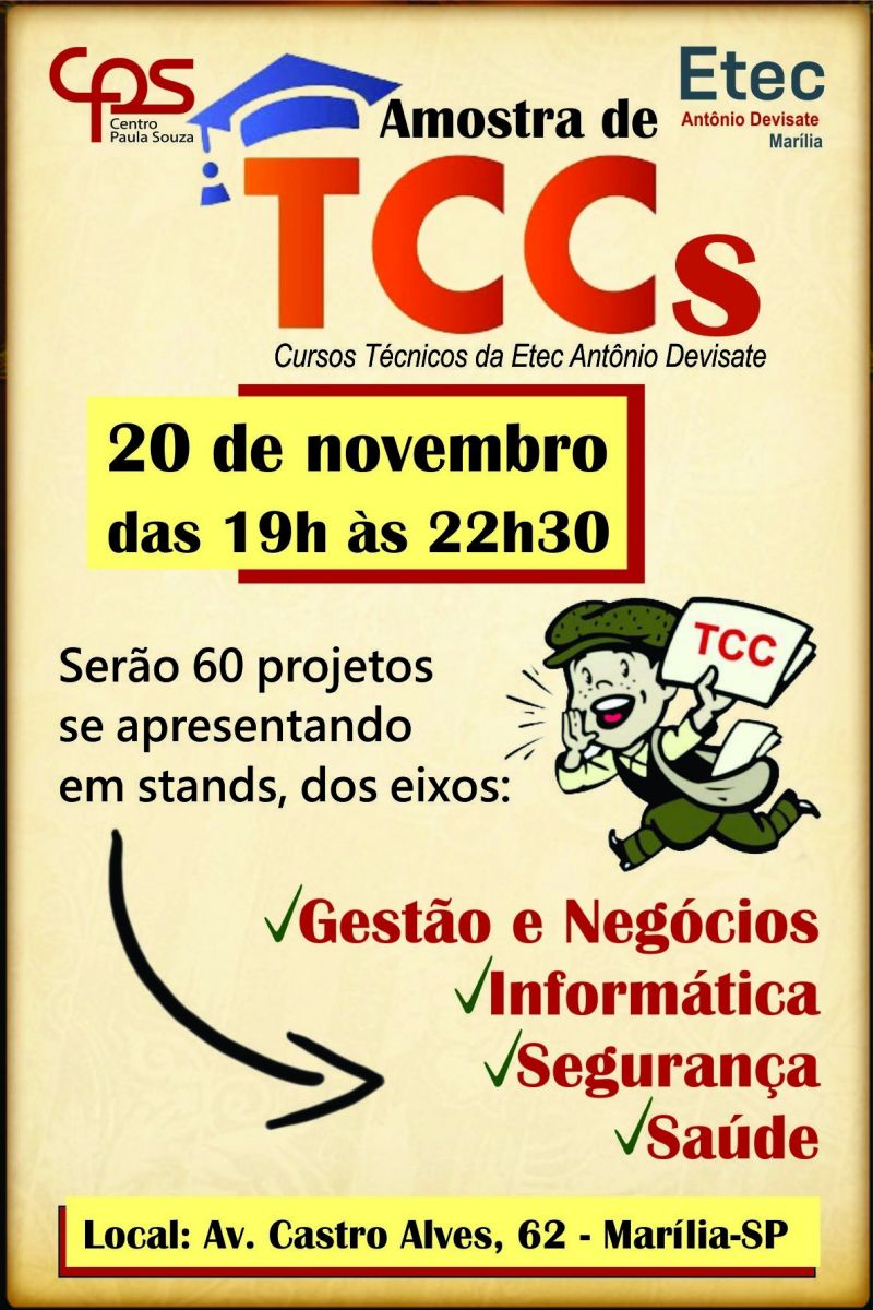 A ETEC Antônio Devisate realizará na próxima sexta-feira, 20, a partir das 19h, a apresentação dos TCC's (Trabalho de Conclusão de Curso) das turmas técnicas da escola.