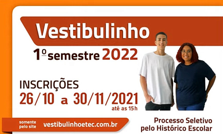 Os interessados em estudar nas Escolas Técnicas Estaduais (Etecs) podem se inscrever no processo seletivo até as 15 horas do dia 30 de novembro, somente pelo site www.vestibulinhoetec.com.br. A taxa integral de inscrição é de R$ 19,00.