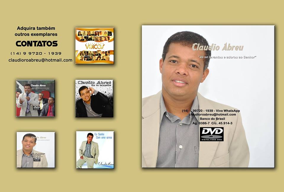 CDs GRAVADOS - A discografia do cantor Claudio Abreu que também é compositor, é de dois álbuns CDs, sendo o primeiro com o título “Eu te levanto” gravado em 2011, o segundo com o título “Eu sonho com uma igreja” gravado em 2014, uma participação no CD Coletânea “VoicesBrazil Gospel” gravado pela Nilson Lins produções em 2017, além de DVDs de mensagens com alguns temas.