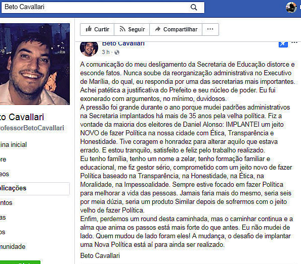 Após três dias, o ex-secretário municipal da Educação, Roberto Cavallari Filho, mais conhecido como Beto Cavallari, rompeu seu silêncio e, em mensagem divulgada nas redes sociais, resolveu dar sua versão para exoneração do cargo.