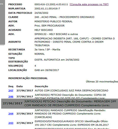 A ação penal teve início em junho de 2002 e, portanto, a sua prisão ocorreu após 15 anos de tramitação do processo e inúmeros recursos.