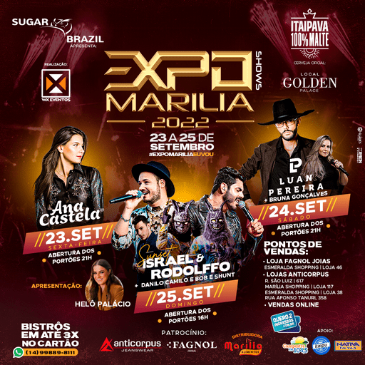 O evento que será realizado dos dias 23 à 25 de setembro, traz ao palco os artistas: Ana Castela; Luan Pereira e Israel e Rodolffo. O local do evento será no Golden Palace, às margens da SP-294.