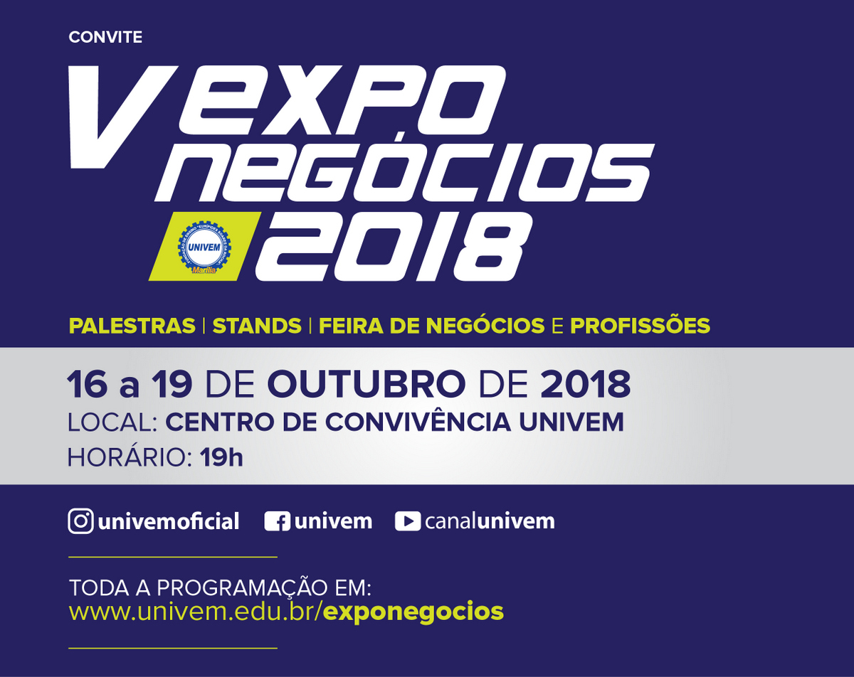 As inscrições devem ser feitas no site www.univem.edu.br/exponegócios2018.