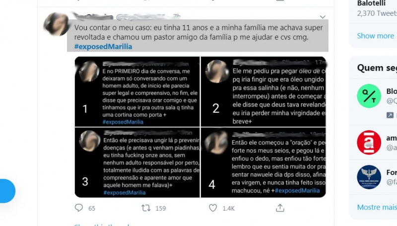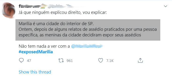 Moradoras de Marília têm usado o Twitter nesta quarta-feira (27) para denunciar casos de abuso sexual que teriam sofrido. A hashtag "exposedMarilia" aparece entre os 10 assuntos mais comentados do Twitter e já teve mais de 5 mil posts.