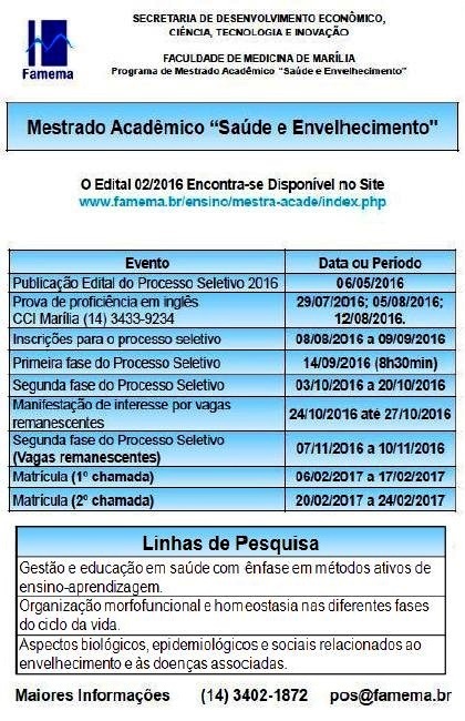 A Diretoria de Pós-Graduação, Pesquisa e Extensão da Faculdade de Medicina de Marília (Famema) divulgou edital para o processo seletivo de candidatos ao Programa de Mestrado Acadêmico “Saúde e Envelhecimento”. As inscrições podem ser feitas até o dia 9 de setembro. O programa contempla profissionais da área de Saúde ou de outras áreas que possam desenvolver projetos inseridos nas linhas de pesquisa do Mestrado Acadêmico.