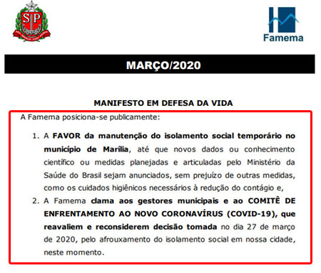 A nota da Famema apresenta alguns pontos sobre o Covid-19, ou seja, o alto risco de transmissão, a aproximação da fase mais crítica da pandemia; existência de três epidemias simultâneas no país (Influenza, Dengue e Coronavírus); possibilidade de colapso no nosso sistema de saúde; os estudos que apontam pelo descontrole da epidemia no Brasil; e também os estudos que associam o isolamento social também como meio mais rápido para recuperação da economia, entre outros.