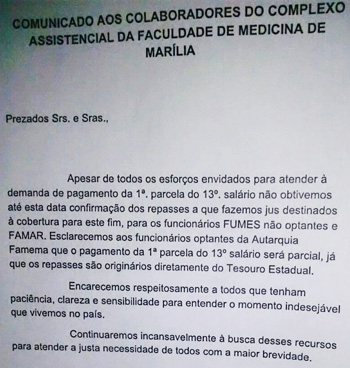 Os funcionários do complexo FAMEMA (Faculdade de Medicina de Marília) ainda não receberam a primeira parcela do décimo-terceiro salário e nem há previsão para esse pagamento. Um comunicado da diretoria foi fixado em local visível em todas as unidades do complexo, gerando preocupação e reclamações dos trabalhadores.