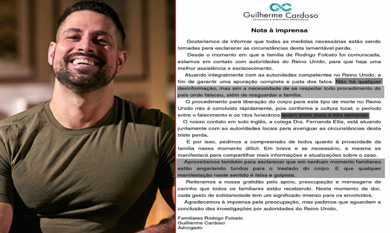 A família do personal trainer, Rodrigo Folcato, que mora em Garça, divulgou uma nota oficial sobre a morte dele negando que esteja arrecadando dinheiro para fazer o translado do corpo do Reino Unido para o Brasil. Informa que qualquer pedido neste sentido seria falsa e golpista.