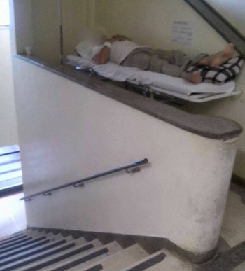 Este paciente aguarda num "canto" entre corredor e escadas do HC. Segundo Adriane, seria mais um que precisa de vaga no hospital São Francisco.