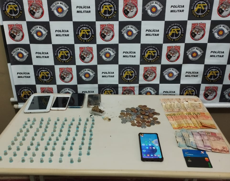 Foram apreendidas 99 porções de crack, uma porção de maconha pesando aproximadamente 20 gramas, R$740,00, quatro aparelhos celulares, um Tablet e três cartões de crédito.