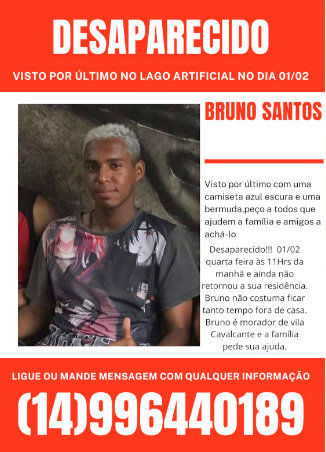 O jovem Bruno Bruno Santos de Oliveira, de 21 anos, morador do bairro Labianópolis, na cidade de Garça, está desaparecido desde a manhã do dia (01 de fevereiro), quando saiu de casa trajando bermuda e uma camiseta azul escura e não foi mais visto.