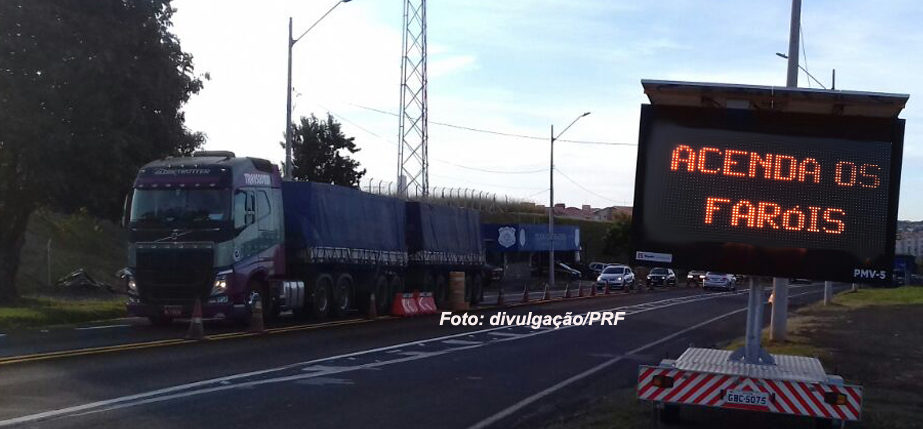 Painel eletrônico instalado na base da PRF em Marília alerta motoristas para o uso do farol baixo aceso durante o dia.