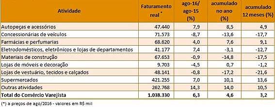 Cinco das nove atividades pesquisadas apresentaram crescimento em relação a agosto do ano passado. As altas mais expressivas foram vistas nos setores de outras atividades (14,3%), supermercados (7%) e autopeças e acessórios (7,9%).