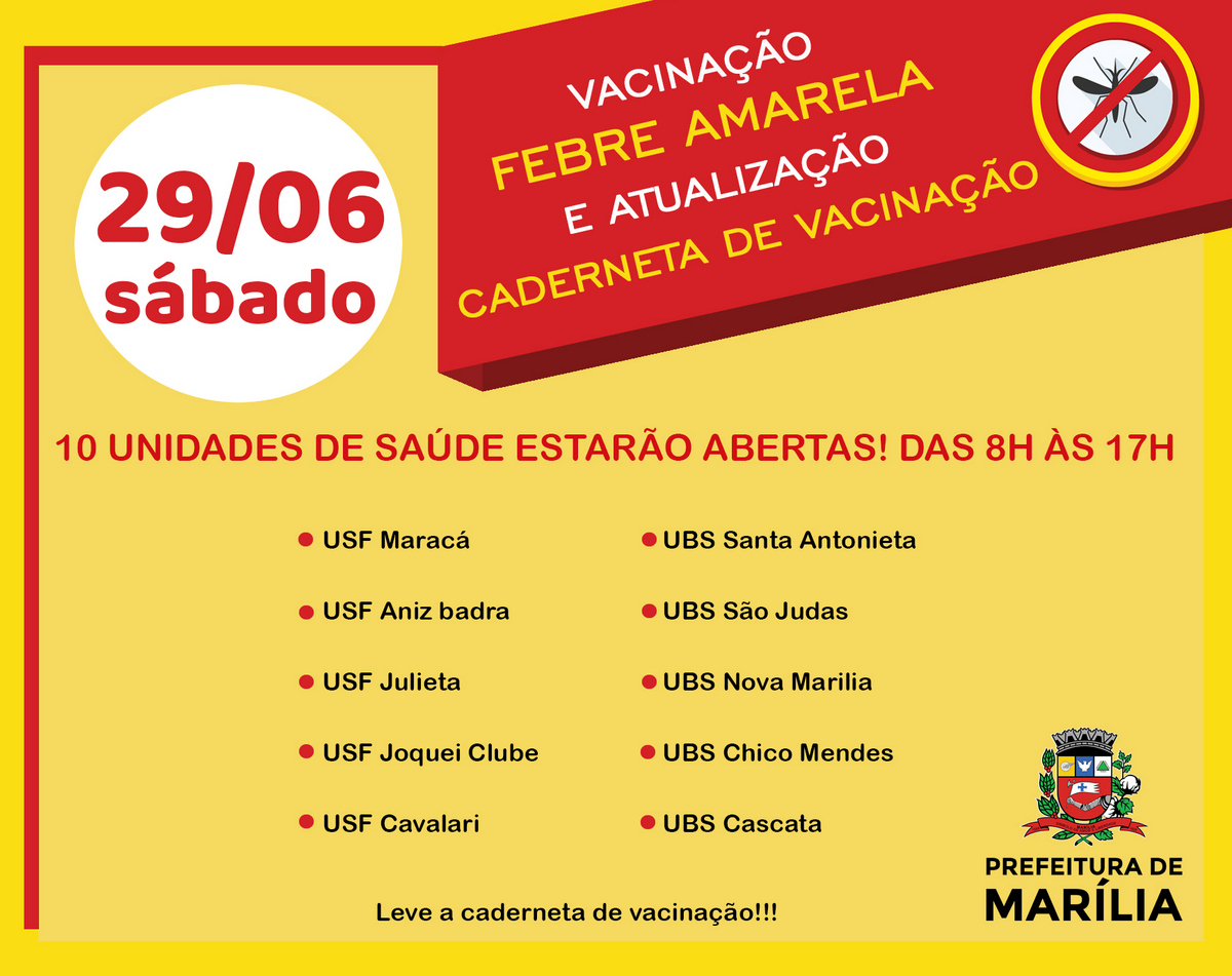Marília participa neste sábado (29) da Intensificação da Vacinação Contra Febre Amarela e Atualização da Caderneta Vacinal e vai abrir das 8h às 17h 10 unidades de saúde da cidade.