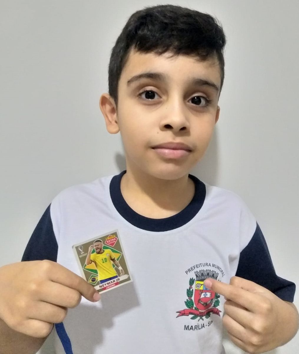 Um desses "sortudos" foi o garotinho Arthur Bueno Menezes (foto), de 8 anos. A família comprou cinco pacotinhos de figurinhas e saiu a do Neymar Jr. "Arthur, está curtindo muito a figurinha pois entre seus grupo de coleguinhas da escola , essa é a figurinha mais top rara", explica o pai, Rodrigo Menezes.