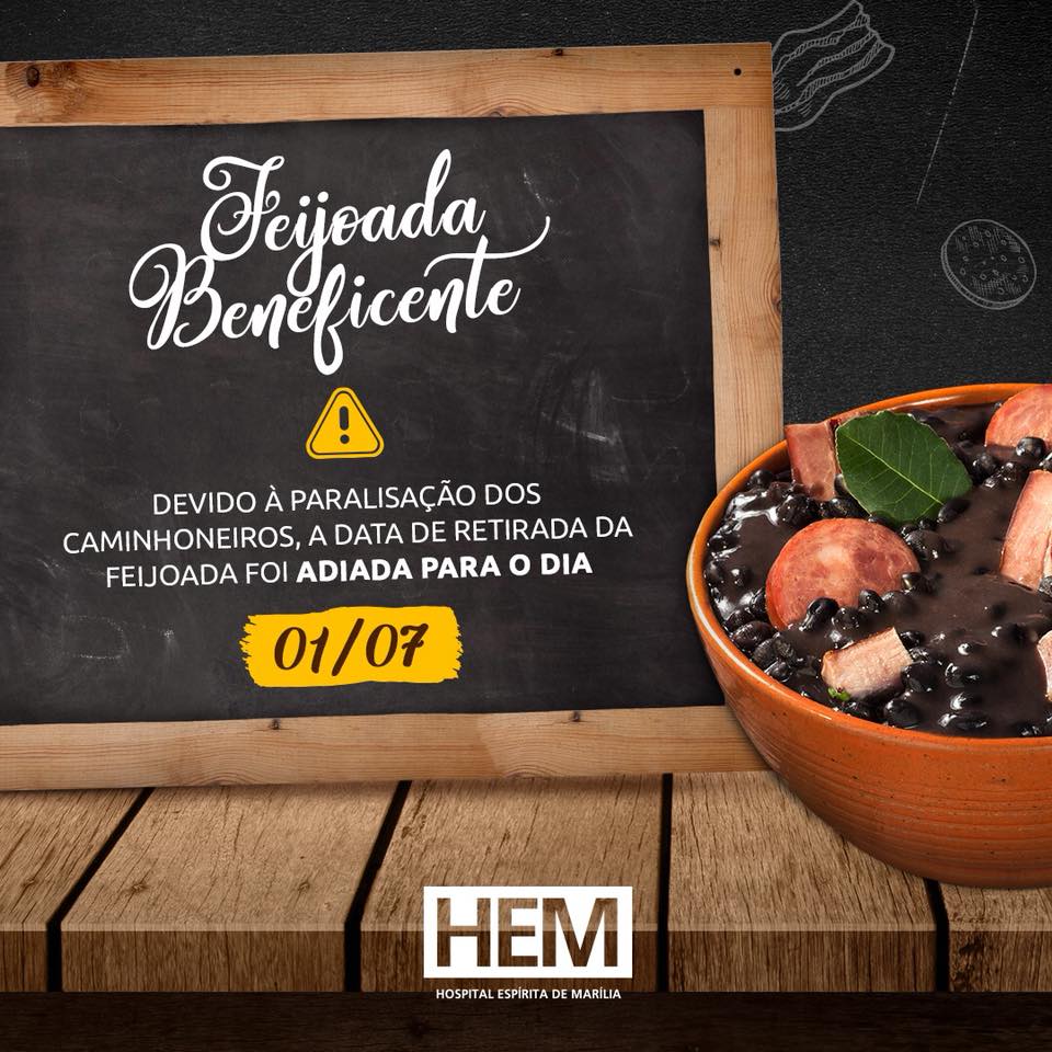 Em virtude da paralisação dos caminhoneiros, que causou escassez nos produtos, a “Feijoada Beneficente” promovida pelo supermercado Confiança, em prol do HEM (Hospital Espírita de Marília) foi transferida para o dia 1º de julho. O evento estava programado para este domingo (dia 10).