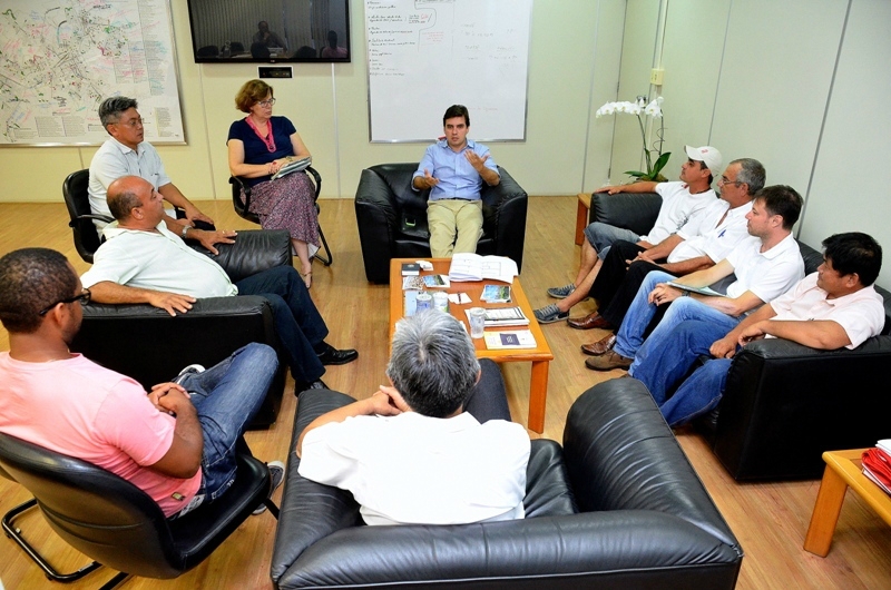 Prefeito Vinicius e secretários reunidos com os feirantes no Gabinete.